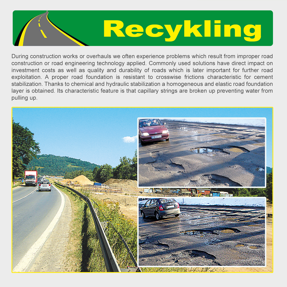 Our solution is based on a permanent soil stabilization (including clay, loose, and swelling soil) employing chemical and hydraulic method. Generally the above mentioned types of soil are often exchanged which causes an increase in investment costs. ECO Roads System stabilization technology is based on soil hardening – during stabilization. During mineral-bituminous pavements overhauls deep stabilization and recycling is employed.