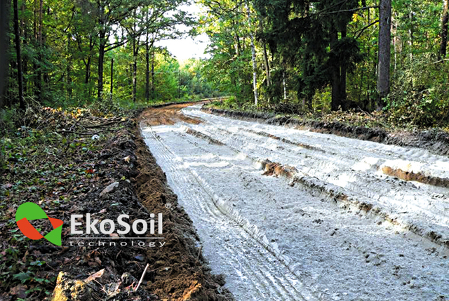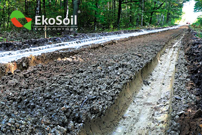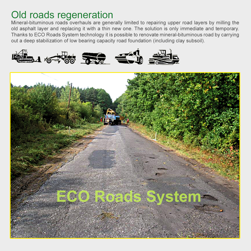 ECO Roads System, in a short period of construction works, enables utilizing 100% of the subsoil, there is no need to use such additional materials as aggregate or to take away excavating material. It enables reducing the costs connected with road engineering.